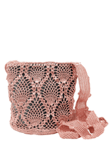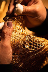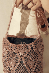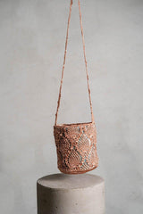 Hand-woven mochila in 100% copper threads with velvet lining and rose gold-plated Italian hardware.